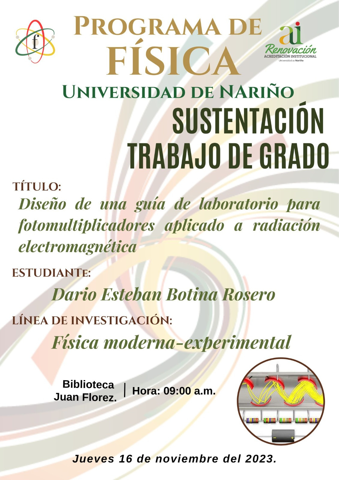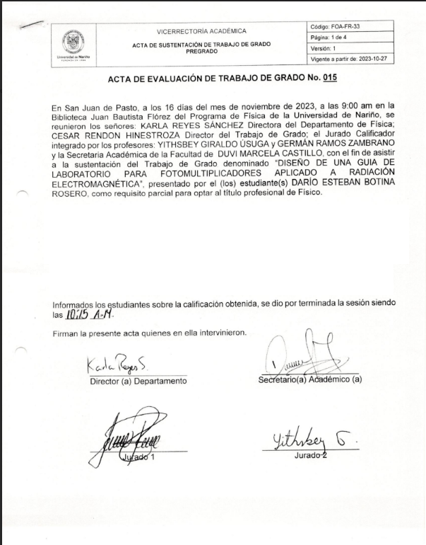 Estudiante: Botina Rosero, Dario Esteban Y Director: Rendon Hinestroza, Cesar (2023) Diseño de una guía de laboratorio para fotomultiplicadores aplicado a radiación electromagnética. Project Report. Universidad de Nariño, Pasto, Colombia. (Unpublished)