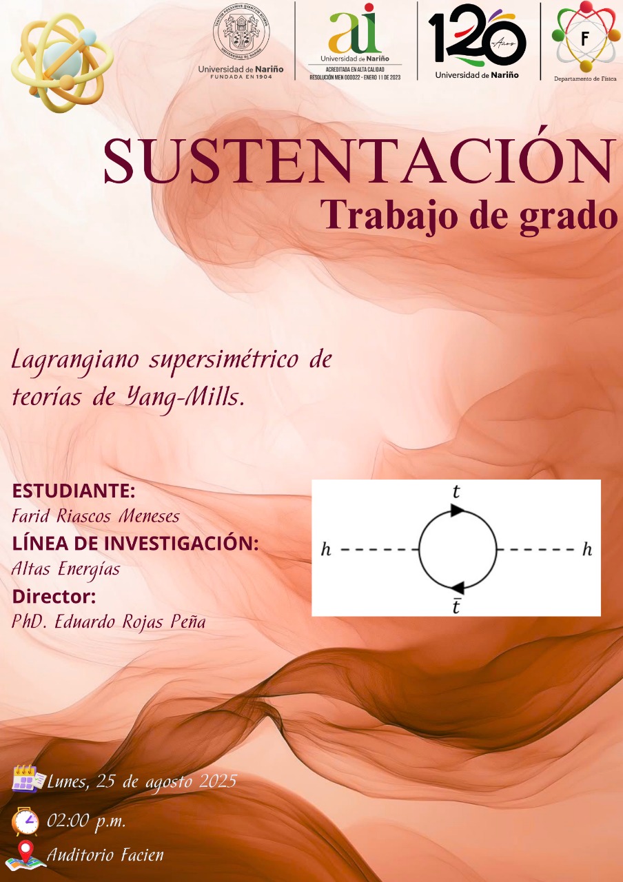 Asesor: Rojas Peña, Eduardo Y Riascos Meneses, Farid (2025) Lagrangiano supersimétrico de teorías de yang-mills. Project Report. Universidad de Nariño, Pasto, Colombia.