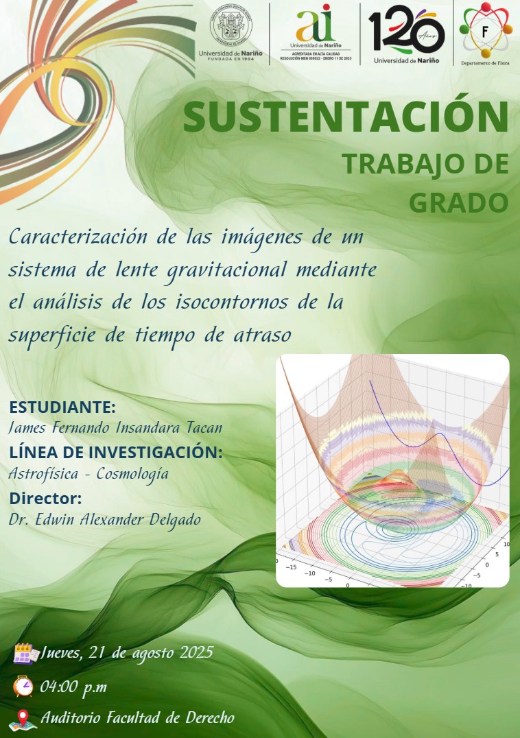 Asesor: Delgado Insuasty, Edwin Alexander Y Insandara Tacán, James Fernando (2025) Caracterización de las imágenes de un sistema de lente gravitacional mediante el análisis de los isocontornos de la superficie de tiempo de atraso. Project Report. Universidad de Nariño, Pasto, Colombia.