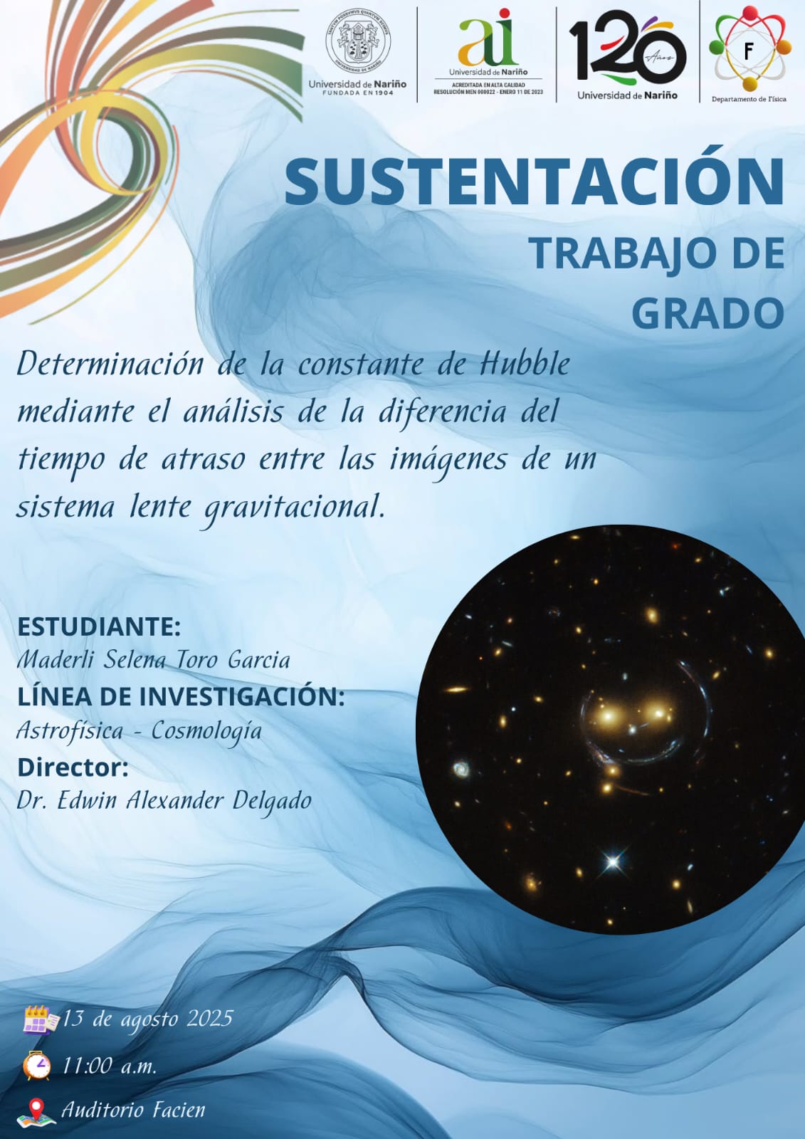 Asesor: Delgado Insuasty, Edwin Alexander Y Toro Garcia, Maderli Selena (2025) Determinación de la constante de Hubble mediante el análisis de la diferencia del tiempo de atraso entre las imágenes de un sistema lente gravitacional. Project Report. Universidad de Nariño, Pasto, Colombia.