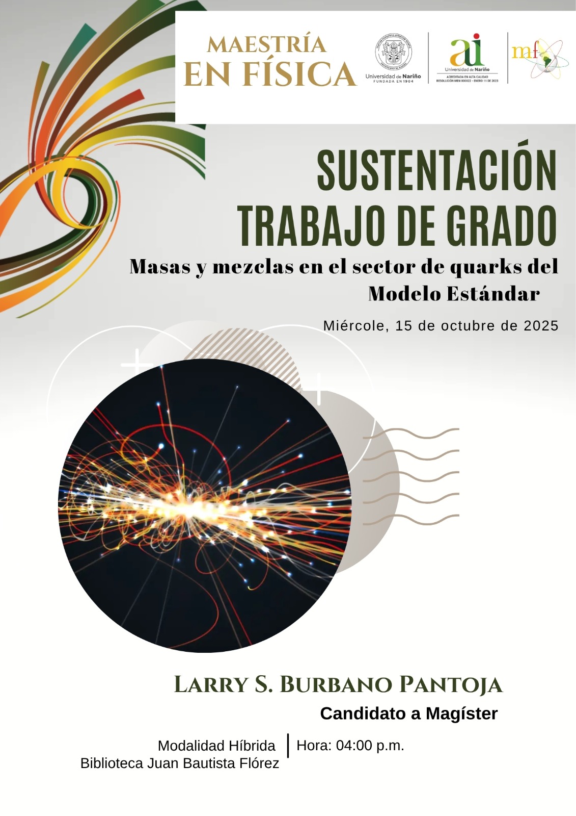 Estudiante: Burbano Pantoja, Larry Segundo Y Director: Giraldo Usuga, Yithsbey (2025) Masas y mezclas en el sector de quarks del Modelo Estándar. Masters thesis, Universidad de Nariño.
